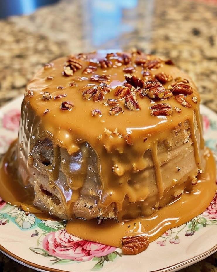 Pour warm caramel glaze over the cooled pound cake, letting it drip down the sides.